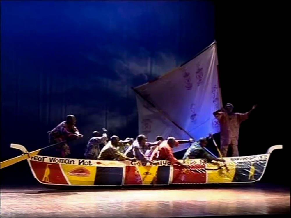 Act I by the Accra Kushite Company showing nine actors/fishermen simulating canoe paddling on stage.18