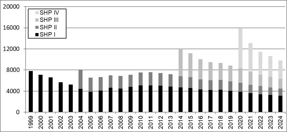 The black or grey shaded parts of each annual bar indicate from which SHP sample the respondents come from. The first sample (SHP I) – black part of the bar – begins in 1999. In 2024, around 3,000 people from this sample were still participating. Their life stories have been documented over a quarter of a century through annual surveys. Refresher samples are added in decreasing shades of grey, which have been surveyed annually since 2004, 2014 and 2020 (SHP II, III, IV).