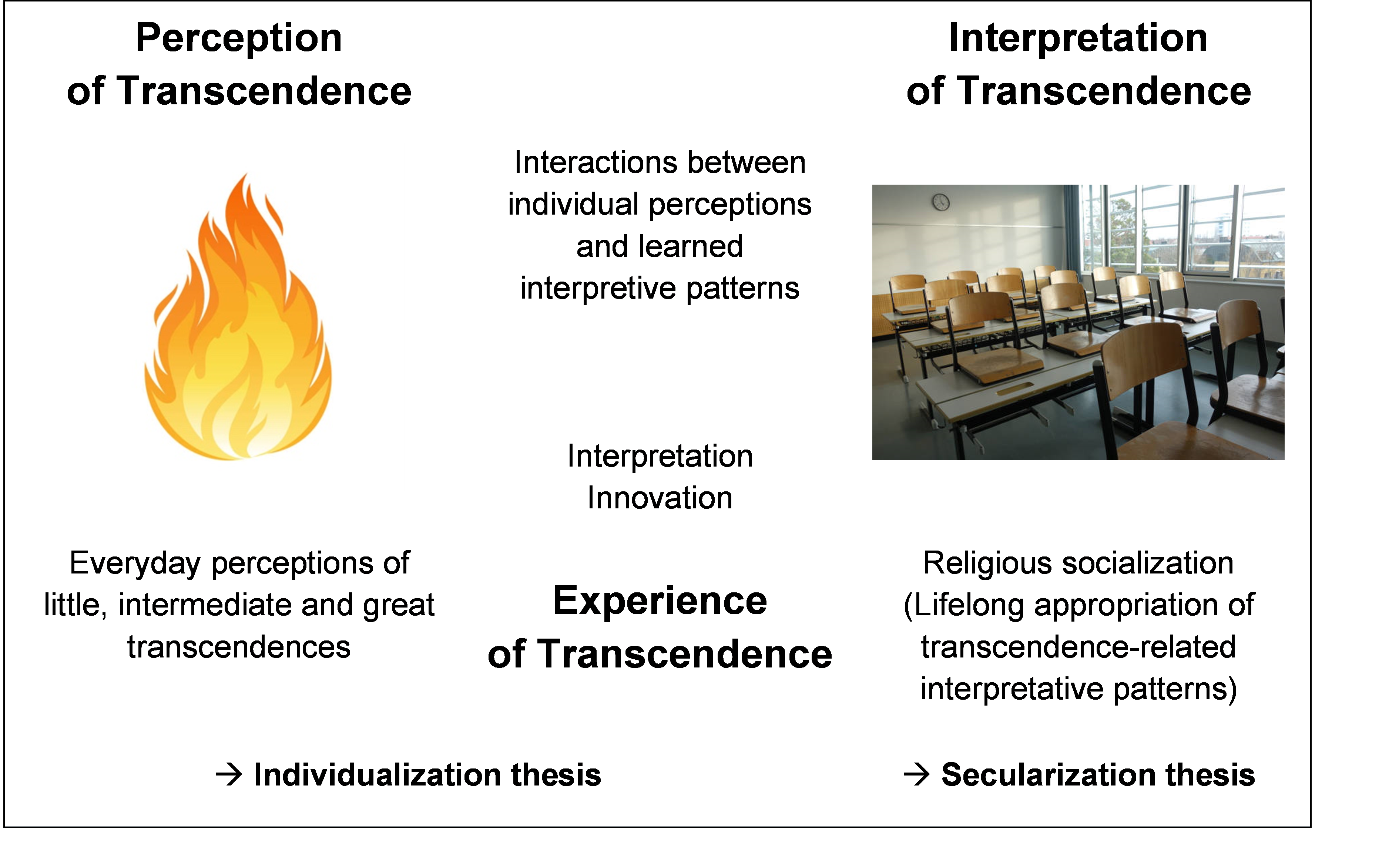 On the right-hand side are interpretations of transcendence. They are based on traditions consisting of stories about and interpretations of perceptions of transcendence, as well as techniques and practices for evoking and actualizing them. These can be found in religious traditions, but also in art and culture, and are conveyed through processes of religious socialization – and I would like to emphasize here: lifelong. Religious socialization never stops, because perceptions of transcendence never stop. Traditional knowledge facilitates the identification, interpretation and handling of perceptions of transcendence. And, last but not least, they can also lead to an increase and deepening of perceptions of transcendence. In the process, quiet and mild perceptions that there is »something« else can become powerful and stormy experiences that lead to radical changes in the self, society and the world.