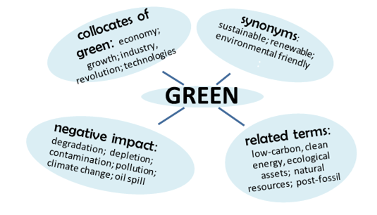 From the 10 texts studied, green occurred in such noun phrases as green buildings , green business , green economy , global green economy , green economy policies , green economy programmes , green growth , green industry , green industry sector , green investment , green job , green market , green options , green sectors , green technologies , greener policies and regulations , and greenhouse gas emissions . It also occurred as complement of verbs: as in be green , make green , being green , go green , considered green .