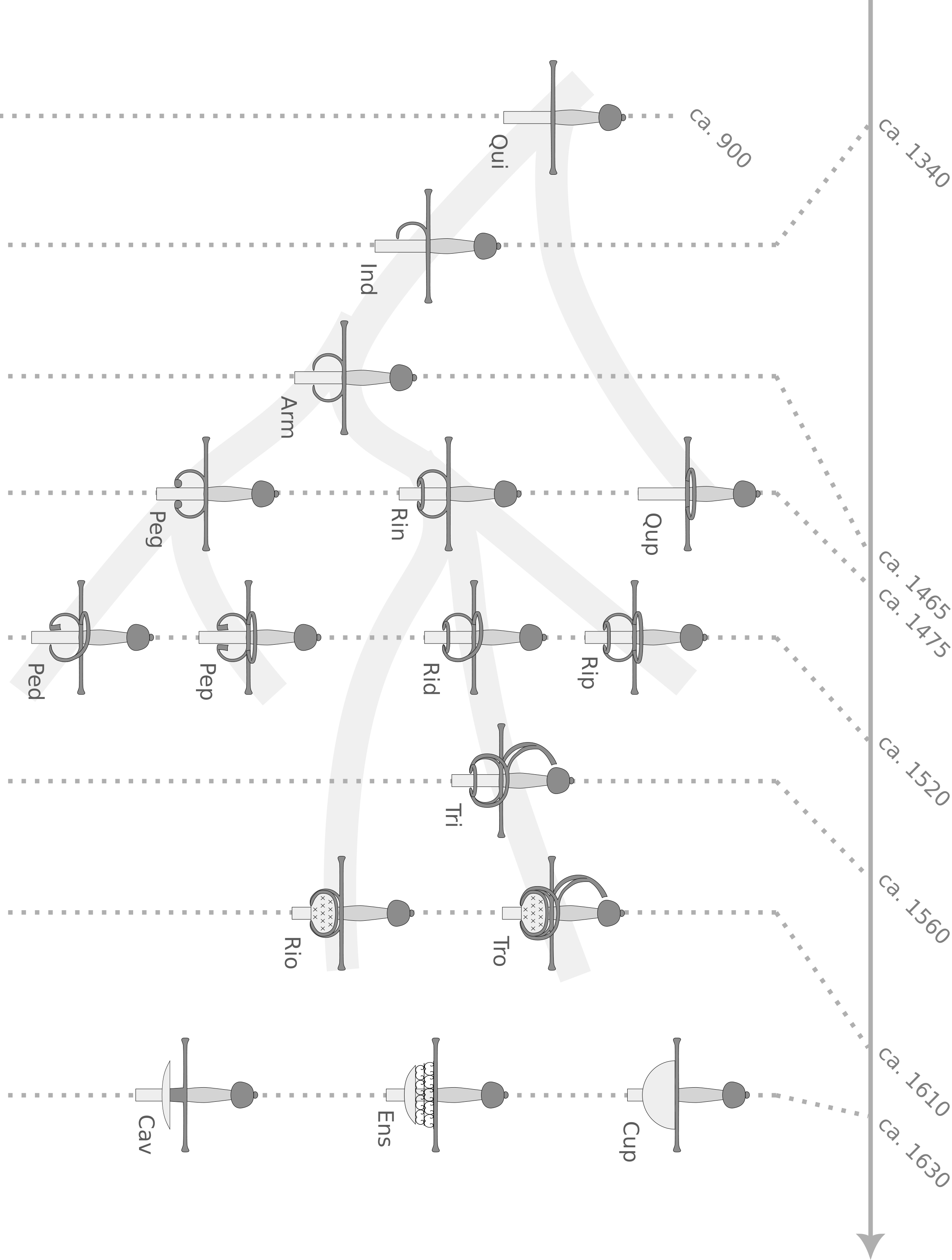 A.V.B. Norman’s typology of hilts currently serves as the standard for the classification of rapiers. However, its flat structure and minutious granularity make it inconvenient for memorization and discussion. This work proposes a restructuration of Norman’s extensive typology into fewer archetypes that renders it less cumbersome to use and follows the functional developments of complex hilts.