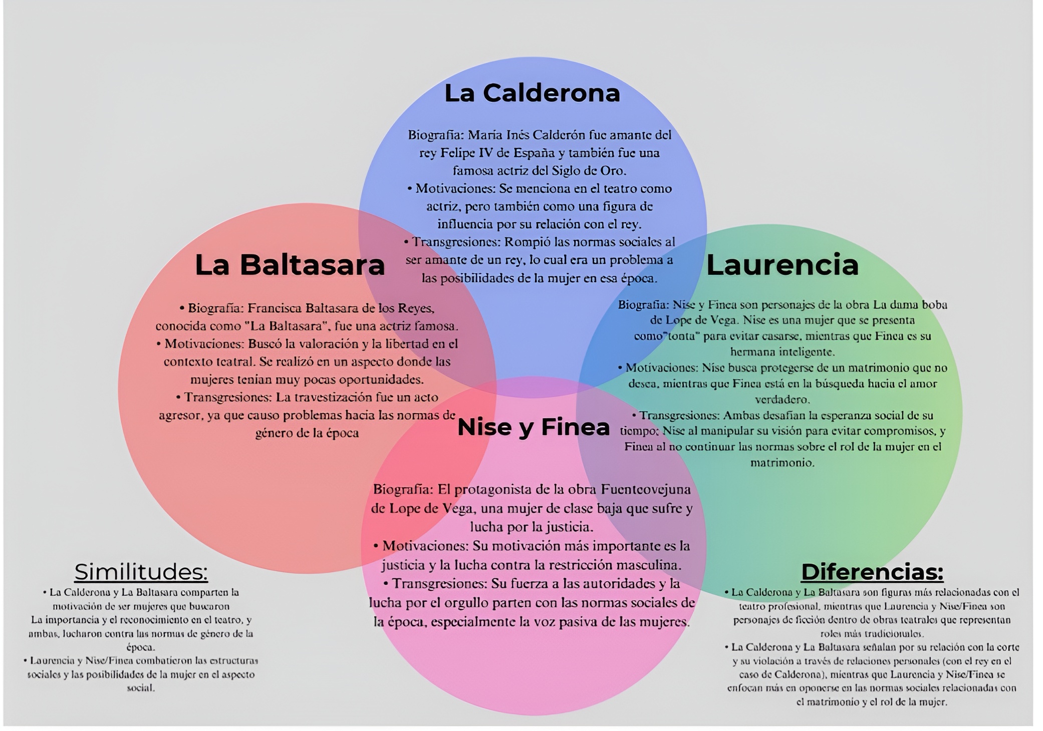 Los diagramas elaborados por el estudiantado muestran una comprensión profunda y matizada de las trayectorias de La Baltasara y La Calderona, y su relación con personajes femeninos de comedias del Siglo de Oro como Laurencia (Fuenteovejuna), Nise y Finea (La dama boba). Las comparaciones reflejan tanto los elementos biográficos e históricos como las motivaciones, transgresiones y resistencias de estas figuras, desde una perspectiva crítica sobre el género, el poder y la individualidad.