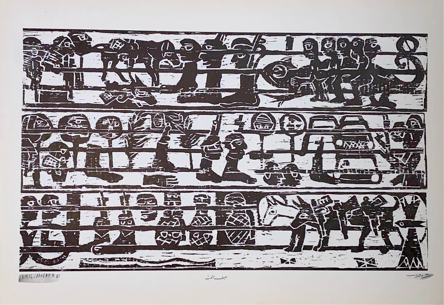 An interview of the artist explaining his approach and the reason why he chose woodcuts was featured in the local newspaper an-Nahar. While he did not describe the iconography of his motifs, he elaborated at length on the meaning of the colours black and white. Accordingly, white was the vitality of life that was carved into the severity of life, as reflected by the black wood blocks.15 Molaeb describes his approach as follows: