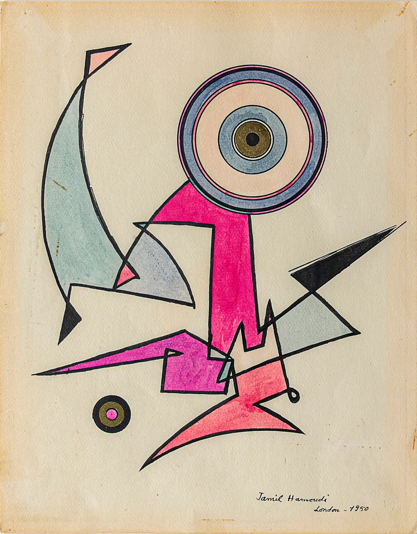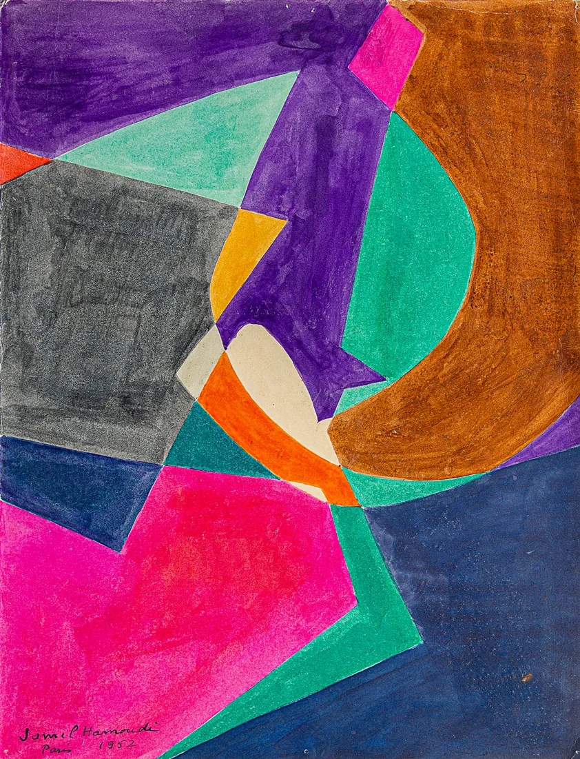 Après la Seconde Guerre mondiale, Paris s’impose comme un carrefour artistique où se croisent des influences multiples, mais selon des dynamiques de reconnaissance inégales. Présentée comme un centre d’avant-garde ouvert aux artistes du monde entier, la scène artistique parisienne manifeste souvent un cosmopolitisme de façade, où faire sa place en tant qu’artiste non occidental n’est pas chose facile. C’est dans ce contexte parisien d’après-guerre que Hamoudi développe sa pratique artistique et sa réflexion théorique. Mais il fait l’expérience d’un environnement artistique dans lequel il cherche sa place, développant une production plastique qui fait dialoguer l’écriture arabe et abstraction occidentale, et une production critique à travers laquelle il valorise les traditions esthétiques irakiennes et arabes. Son activité foisonnante lui permet de se positionner comme un acteur à part entière de la modernité artistique, pas seulement en absorbant les influences occidentales, mais en les interprétant à travers ses propres traditions visuelles2. Comme ses collègues irakiens Faiq Hassan (1914–1992), Jewad Selim (1919–1961), Ismail al-Shaikhly (1924–2002), Naziha Selim (1927–2008)3, Jamil Hamoudi développe une esthétique hybride, où l’écriture, les motifs traditionnels et les compositions abstraites se croisent pour ouvrir de nouvelles perspectives plastiques.