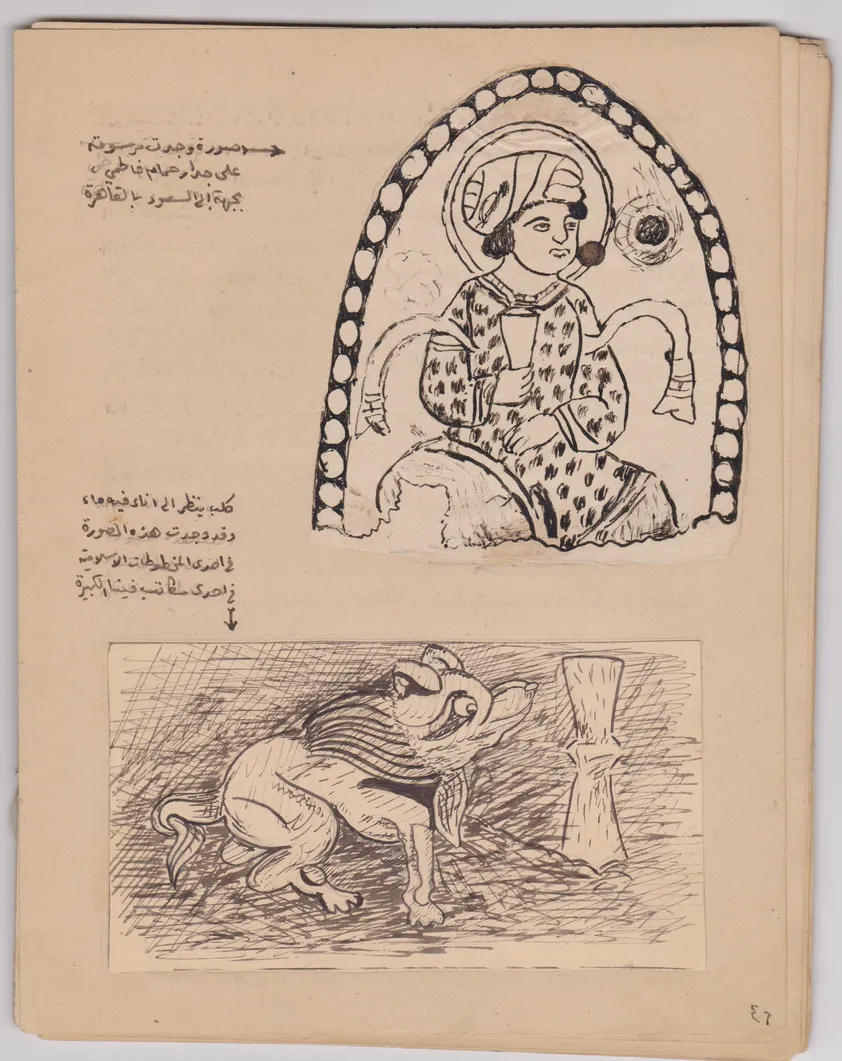 ![Illustration non signée, probablement réalisée par Jamil Hamoudi, accompagnant son texte « al-fann al-islami », publié dans <i>ʿAshtarut</i>. Légende originale : « Image trouvée sur le mur d’un bain fatimide, du côté du mur d’enceinte au Caire » [le fragment est conservé au Musée d’art islamique du Caire, consulté le 23 avril 2025, <a href="https://islamicart.museumwnf.org/database_item.php?id=object;isl;eg;mus01;26;fr">https://islamicart.museumwnf.org/database_item.php?id=object;isl;eg;mus01;26;fr</a>] et « Chien regardant un bol d’eau ». Cette image a été découverte dans un manuscrit islamique conservé dans l’une des grandes bibliothèques de Vienne. Avec l’aimable autorisation d’Ishtar Hamoudi. Photographie : Ishtar Hamoudi.](https://bop.unibe.ch/manazir/article/download/11689/version/11989/15155/57687/mazh8ag2iqxr.webp)