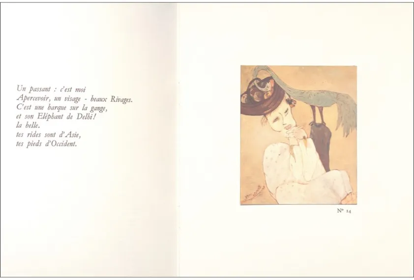 La richesse de l’œuvre d’Hajeri, déclinée à travers le dessin, la peinture et la poésie, réside dans l’inventivité, l’authenticité et une irréductible fidélité à son esthétique originelle. Son langage pictural, défini dès ses premières peintures, s’accompagne d’une œuvre poétique, qui s’affirme comme l’un des moyens d’expression privilégiés d’Hajeri durant sa jeunesse en Tunisie et ses années passées à l’orphelinat de Carthage. Dans le catalogue de la première exposition de l’artiste à la Galerie Messine en 1978, chaque œuvre dialogue avec un poème. Le visage au regard souriant de La Belle du Monde, 1977, coiffée d’un panier de fruits autour duquel s’enroule un paon, résonne ainsi avec des vers datés de 1974 (fig. 7) où le fleuve est une métaphore du temps et de la jeunesse qui passent52.