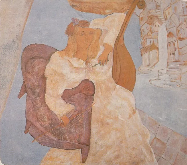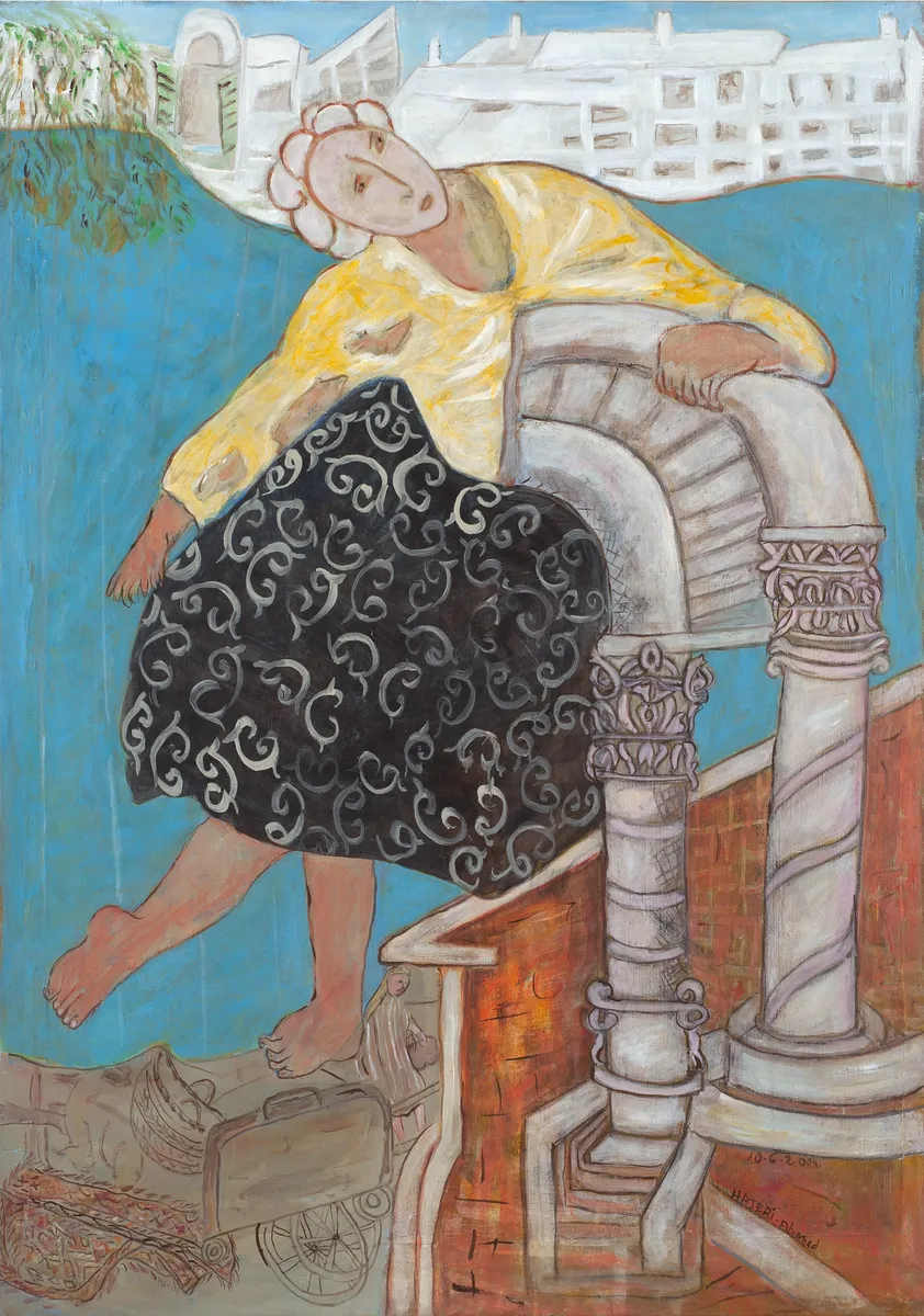 L’avènement d’une carrière artistique tunisienne et la rencontre d’Hajeri avec un nouveau réseau professionnel de galeristes et marchands d’art parisiens dans les années 1990–2000 lui ouvrent la voie de nouveaux horizons en France et à l’étranger. En 1997, Fanny Guillon-Laffaille, spécialiste de Raoul Dufy, présente une exposition personnelle de l’artiste dans sa galerie, située avenue de Messine, à proximité de celle de Thomas Le Guillou, tandis qu’Aude Oumow ouvre l’exposition Ahmed Hajeri. Toiles et dessins dans sa galerie de Saint-Germain-en Laye. Cette dernière loue la « libre spontanéité » du peintre et son affranchissement des conventions picturales qu’elle relie au courant de l’art moderne occidental : « Les toiles d’Ahmed Hajeri, bien que profondément imprégnées de culture arabe – l’artiste retourne d’ailleurs régulièrement en Tunisie – se situent entièrement dans la mouvance de la figuration occidentale ». Elle attribue la simplification opérée à « la force de l’instinct auquel l’artiste se fie entièrement, suivant ainsi et sans le savoir, le conseil de Matisse32 ». La référence au maître moderne se retrouve notamment dans la délicatesse des traits et des courbes d’une musicienne assise dans un fauteuil, accoudée à son instrument, une rose à la main dans une atmosphère céleste empreinte de sérénité (La Musicienne, 1976) (fig. 2). De même, le dessin épuré du visage féminin et de la chevelure, la stylisation des motifs ornementaux et les lignes sinueuses des Colonnes de la Mémoire, 2000 (fig. 3) ne sont pas sans rappeler les portraits de Matisse et ses arabesques inspirées de l’art oriental.