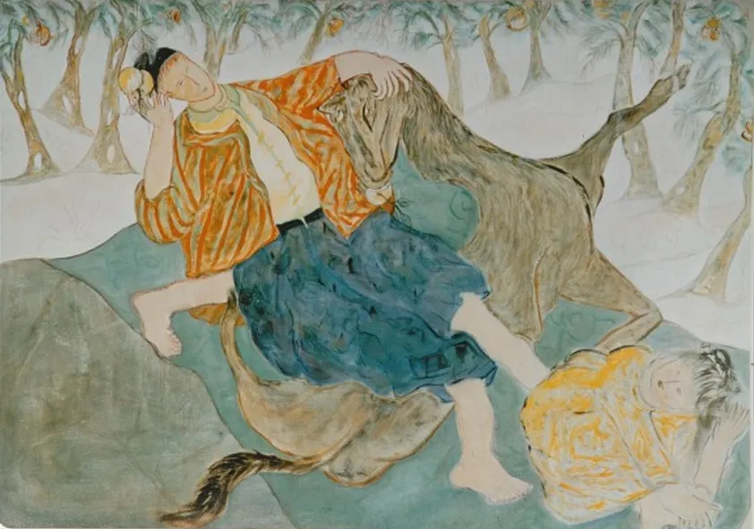 La distorsion du réel et l’agencement organique de formes imbriquées s’étendent au cadre naturel. Des paysages semblant éternels sont le cadre idoine pour une harmonie, voire une fusion, entre espèces humaines, animales et végétales où l’animal est présenté en miroir de l’homme (La Pomme, 1989) (fig. 8). La vision mêlée d’êtres humains et d’un bestiaire souvent anthropomorphe, comme les créatures aux morphologies hybrides et difformes, confèrent à l’œuvre une dimension existentielle, en interrogeant la nature humaine et son rapport au monde. Décrivant la solitude qu’il a connue enfant, Hajeri explique : “Le rêve était alors mon unique échappatoire. Eveillé ou endormi, je rêvais ; et dans mes rêves je me voyais – je me vois toujours – planant au-dessus du monde réel, de ses obstacles et ses difficultés. Les personnages de mes tableaux font de même, parce que les histoires dont ils sont les héros sont souvent tristes53.”