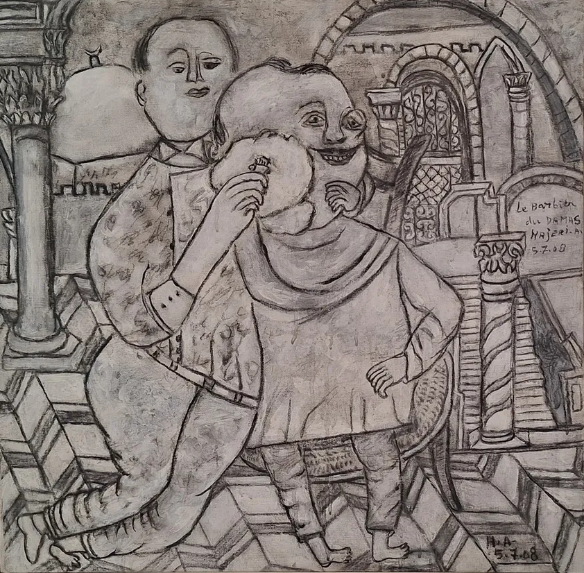 En 2001, l’artiste illustre des extraits du Livre des animaux39 de l’écrivain du Moyen Age Al-Jâhiz dans Le cadi et la mouche, publié par l’IMA et préfacé par André Miquel, historien spécialiste de langue et de littérature arabes40. Puis, en 2008, l’exposition Paris, Damas : regards croisés41 , destinée à un rapprochement culturel de ces deux capitales, réunit cinquante-huit artistes contemporains qui sont établis à Paris. Hajeri présente une des rares peintures noir et blanc de sa carrière, Le Barbier de Damas, 2008 (fig. 4), de nouveau exposée à la galerie Arcanes de Rabat au Maroc en 201042 et qu’il a toujours souhaité conserver.