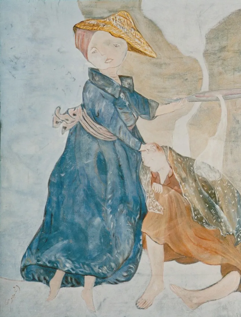 L’originalité de cet art, ainsi que l’ambiguïté entre abstraction et figuration, peuvent expliquer la difficulté à classer l’œuvre d’Hajeri parmi les grands courants contemporains. L’œuvre polysémique, régie par l’unique pouvoir d’imagination de l’auteur, fait écho à l’iconographie de Chagall, à ses personnages errants, volant au-dessus des toits, mais s’en distingue par l’absence de sujets religieux et par les références au patrimoine arabe et méditerranéen qui lui procurent toute sa singularité59. Malgré sa rencontre avec Dubuffet et ses débuts autodidactes, il ne figure pas dans la Collection de l’Art Brut à Lausanne, fondée par ce dernier. La sophistication de sa technique, sa recherche de transparence et de légèreté dans l’application de multiples couches de couleur, réhaussées d’un fin trait noir matissien pour cerner les contours des motifs et figures, les subtils accords de couleurs qu’il compose lui-même, la sensualité d’une palette douce et lumineuse inspirée des harmonies patinées de la fresque, transcendent également la catégorie de l’art naïf. Enfin, Hajeri ne prend pas part aux débats ni ne rejoint l’École de Tunis lorsque Gorgi le sollicite en ce sens.