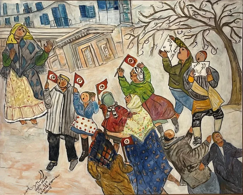 J’ai aussi souhaité rendre hommage à la révolution tunisienne avec La Liberté d’expression. C’est d’abord une scène de joie universelle, une ère d’espoirs qui s’ouvre. J’ai souhaité saisir l’énergie vibrante de ces scènes de liesse. Je ne me suis jamais senti politisé, mais je suis convaincu que la liberté d’expression est une condition à l’exercice épanoui de l’art. […] Si la joie du peuple est sincère, les années de silence ont rendu cette notion abstraite pour beaucoup43.