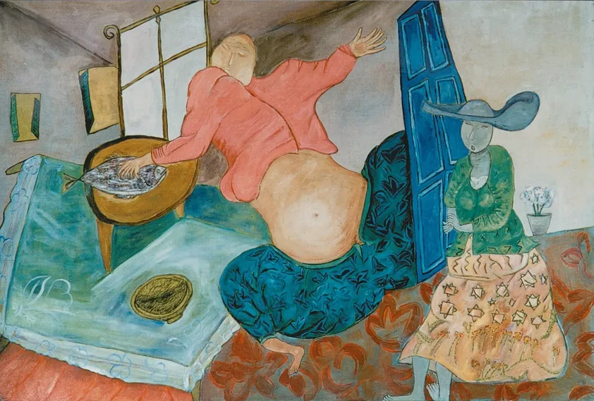 Ce retrait du monde réel, ou vu d’en haut, à hauteur d’ange, abolit la distinction entre rêve et réalité. Dans cet univers recomposé, les références récurrentes à la Tunisie antique, aux vestiges des civilisations phénicienne et gréco-romaine, occupent une place de choix dans l’imaginaire de l’artiste. Elles évoquent une temporalité qui dépasse les stricts enjeux actuels, comme les ruines de La Cité de Carthage, 1984 (fig. 9), traversées par le fil du temps qui s’étire entre passé et présent. L’un des ressorts de l’irréalité de ces scènes tient en un détournement des codes de la représentation traditionnelle qui se substitue aux lois de la perspective albertienne. Les jeux d’échelle et de proportion font coexister des figures anormalement disproportionnées, démesurément grandes ou petites (Le Poisson54, 1976) (fig. 10).