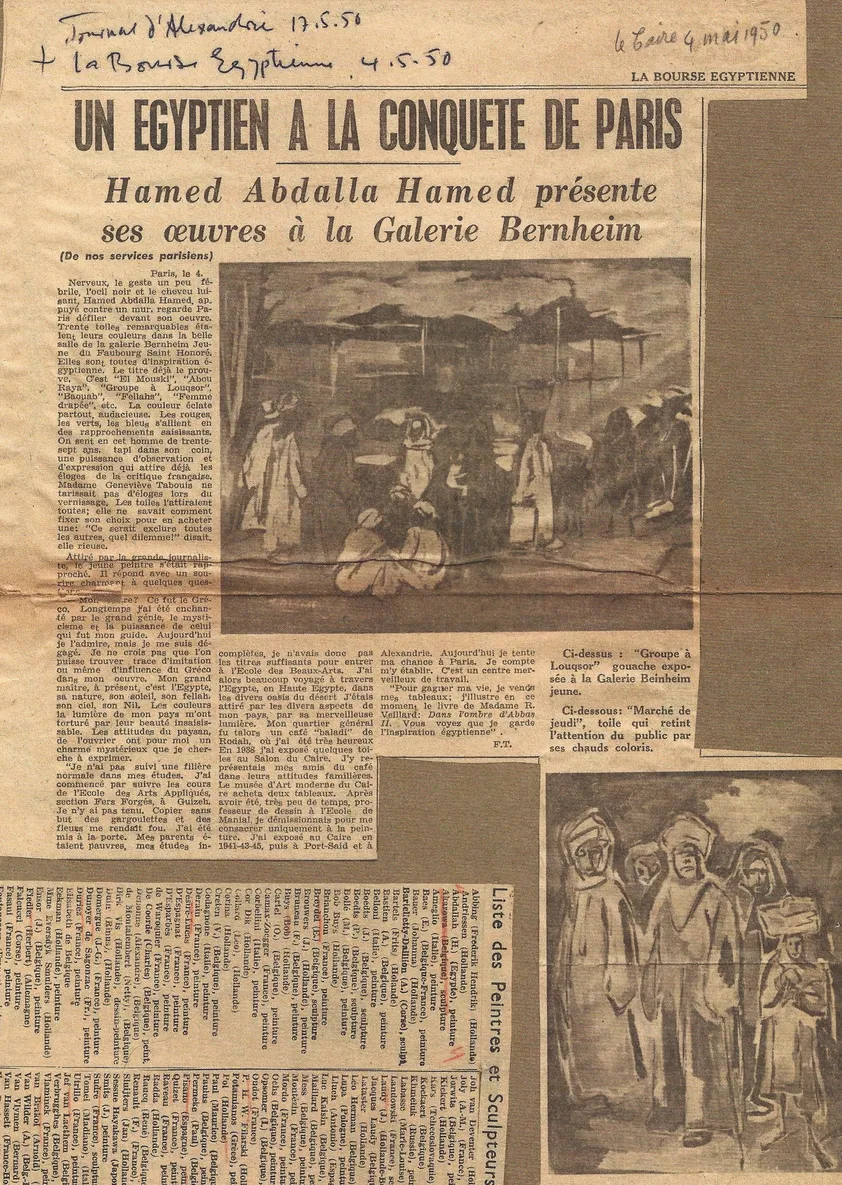 Nous aimerions commencer par le départ de Hamed Abdalla pour Paris. Pourquoi ce choix alors qu’il a construit sa renommée en Égypte (rétrospective au musée d’art moderne du Caire en 1956) ? Quelles sont ses conditions de vie en France, pourquoi Paris et combien de temps reste-t-il ?