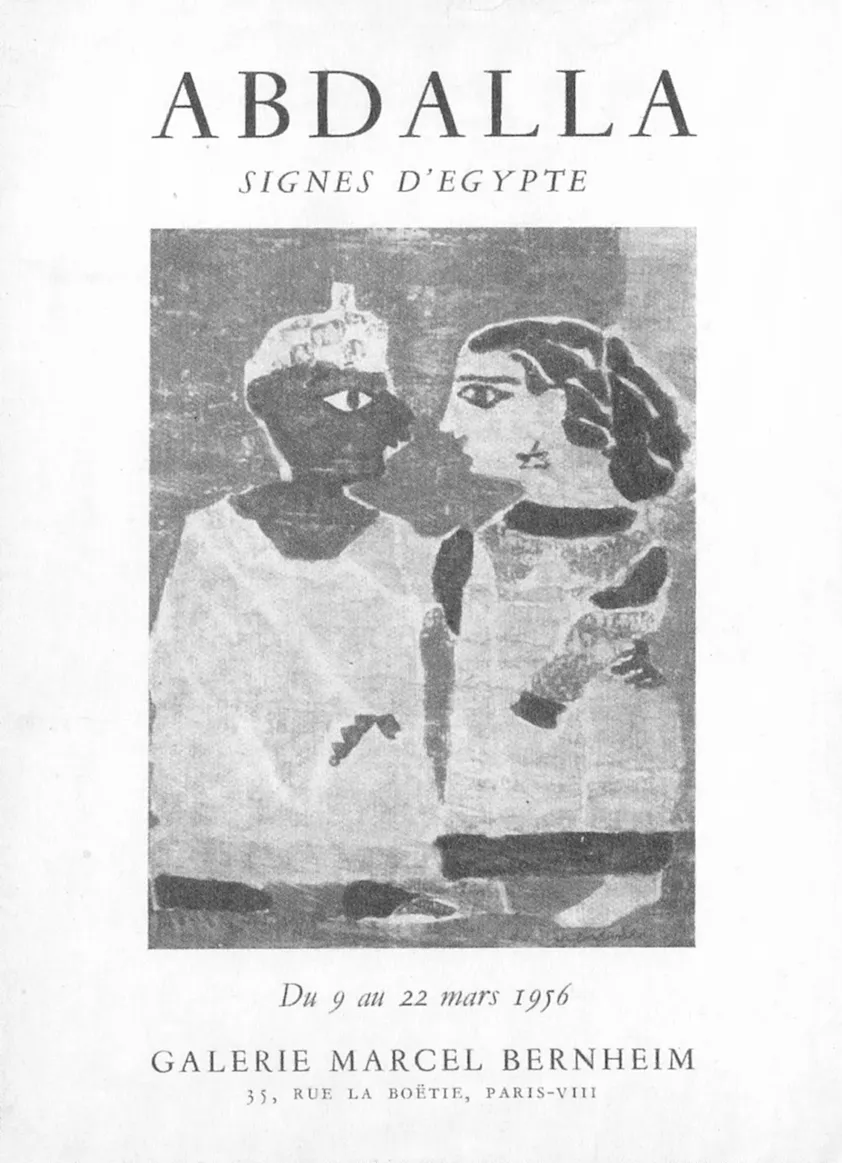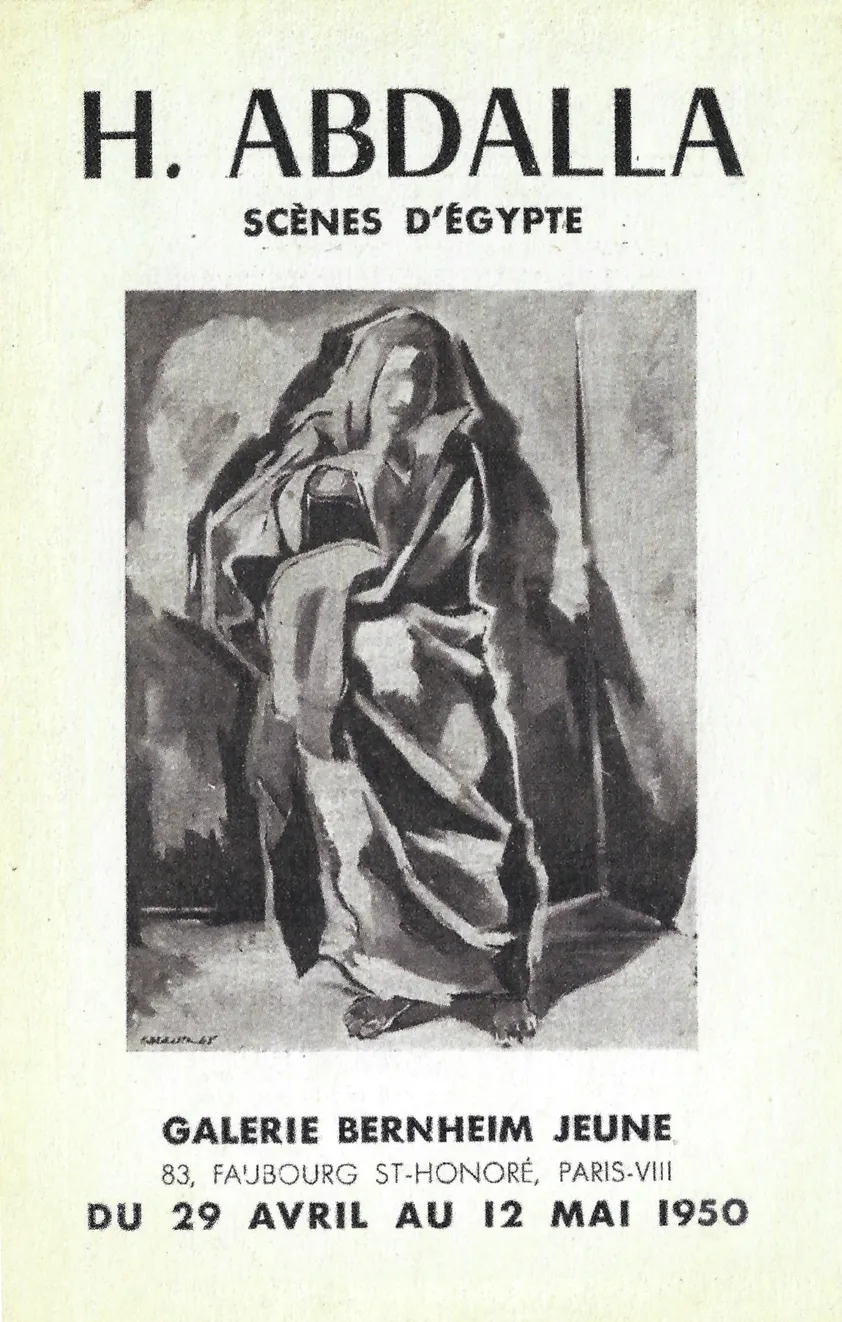 Ce cercle cosmopolite compte également des figures politisées, engagées dans la lutte contre la colonisation et dans le mouvement communiste et internationaliste, qui reconnaissent en Abdalla un homme du peuple capable de porter sa voix. Cette reconnaissance lui ouvre des portes et le conduit à Paris où il arrive pour la première fois en 1949. Ici, il participe, d’abord, à une grande exposition à l’automne 1949, au pavillon de Marsan, qui porte aussi bien sur l’art moderne égyptien que sur l’Égypte ancienne2. Abdalla y contribue avec une ou deux œuvres. En mars 1950, la galerie Bernheim-Jeune lui consacre une exposition3 (fig. 2) qui obtient un énorme succès grâce à des critiques dithyrambiques dans la presse. Il en ressort avec la réputation d’un artiste égyptien parti à la conquête de Paris.