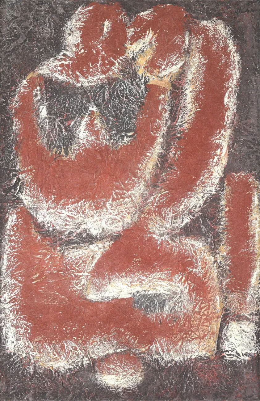 Même s’il y a pleins d’autres termes qui ont été utilisés, comme par exemple le mot « forme » qu’il utilisait lui-même, ou l’expression « écriture anthropomorphique », une « écriture qui suggère des figures humaines », je dirais, en effet, que l’expression la plus juste serait « al-hurufiyya al-ta‘biriyya » qui veut dire « lettrisme expressionniste ». En juin 1967, à Damas, puis l’année suivante à Beyrouth, il aura d’ailleurs l’opportunité de faire une grande exposition rétrospective de son œuvre lettriste. C’est à ce moment-là que ses œuvres de ce type sont montrées pour la première fois dans un pays arabe. Il les avait déjà largement exposées au Danemark dès les années 1957–1958. En réalité, son travail avec les lettres arabes date du début des années 1950, mais il le développe largement à la fin de cette même décennie. Son œuvre est fortement marquée par les thématiques politiques tel qu’illustré par les titres de plusieurs œuvres (Révolution, Défaite, Régrets, Lève-toi, Esclavage, La Guerre, Liberté). À côté de cela, il explore aussi des sujets plus doux (Talisman, Amour, Affection, Couple, Amants), car cette période est pour lui profondément romantique. Il est très amoureux de ma mère, ce qui lui inspire une série érotique avec des lettres arabes évoquant l’amour ou la maternité. Il aime également célébrer toutes manifestations de la vie (fig. 7).
