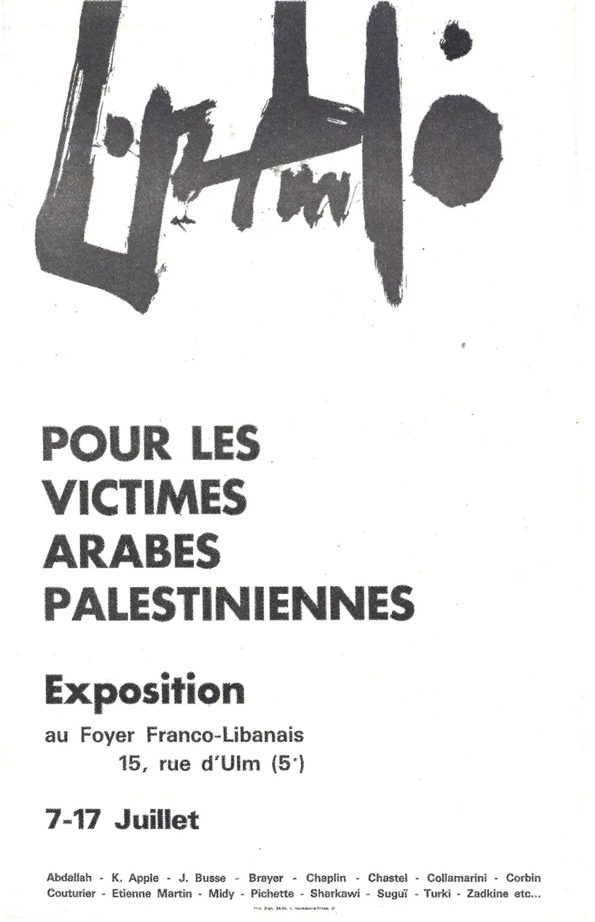 Oui, tout à fait. Les années passent et Abdalla est toujours très connecté avec la mouvance palestinienne, pro-palestinienne arabe, européenne et française (fig. 8). Son retour à Paris en 1966 a pour principal objectif de se reconnecter avec la scène artistique mondiale, notamment avec le milieu des artistes et des révolutionnaires venus non seulement du monde arabe mais aussi d’Afrique. En 1973, en 1975 et 1976, il participe donc à des expositions de solidarité avec la Palestine et de soutien au peuple libanais et palestinien. En 1978, se tient la fameuse exposition pour la Palestine à Beyrouth pour laquelle son œuvre Défaite du Sionisme est exposée à la suite de sa donation. C’est à cette occasion qu’il écrit une lettre11 à Mona Saudi, qui dirigeait la section plastique de l’OLP, en disant : « Je donne toute ma collection qui est chez Adonis, 145 œuvres, je la donne pour la résistance armée du peuple palestinien, pour la libération totale de la Palestine », les deux points étant soulignés ! Cependant, comme je l’ai dit, Adonis prétend que les œuvres ont disparu, qu’il y a eu un bombardement, que l’endroit a été détruit, qu’il ne se souvient plus trop bien…. Enfin, on ne sait pas quelle est la part de vérité… Il ne sait pas lui-même. Ce qui est important, c’est qu’Abdalla n’était pas soutenu par les milieux dits des marchands en Europe, ni par les milieux institutionnels qui avaient tendance à marginaliser des artistes, à les invisibiliser, surtout lorsqu’ils avaient une pratique et un discours qui ne s’alignaient pas avec ce qu’on attendait d’eux, à savoir célébrer et se conformer au génie français ou européen.
