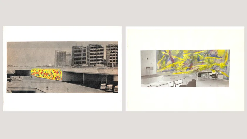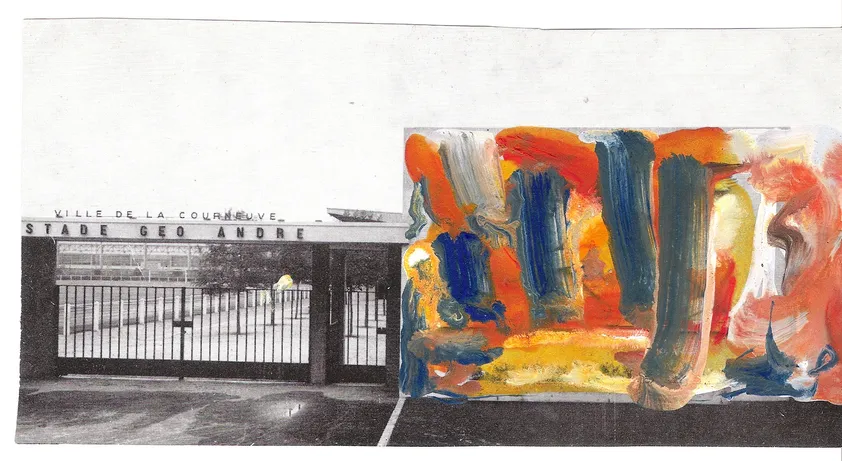 Soit une vue photographique en noir et blanc de l’entrée du Stade Géo André à La Courneuve, mettant en avant, dans la partie gauche, son architecture et sa grille métallique fermée, dans une composition frontale et symétrique (fig. 1). À droite, une effusion de couleurs vives – rouge, orange, bleu et jaune – éclate, déposée par de larges coups de pinceaux expressifs. Une fresque in situ ? La matérialité du dispositif révèle que la peinture a été apposée directement sur la photographie, puis insérée sur la surface d’un mur. En réalité, la photographie est une image imprimée extraite d’une revue dont l’origine reste inconnue. Cependant, la qualité du papier et le style de l’impression suggèrent qu’elle pourrait dater des années 1960. Cette image est collée sur une feuille blanche de format A4, lui donnant une nouvelle signification, un nouveau statut. Dans le contraste entre la gestualité de la peinture expansive et le format du support photographique aux dimensions contenues, se dessine l’idée d’une mise en situation de la peinture dans l’espace architectural. Cette œuvre appartient à une série réalisée selon le même principe par l’artiste Selim Turan1 (fig. 2) qui a vécu à Paris depuis 1947, dévoué à son art et menant une carrière discrète, mais non moins prolifique, dont l’atelier parisien, impasse du Rouet dans le 14e arrondissement, débordait de tableaux, de mobiles, de cartons à dessins, etc. Cette série interpelle lorsque l’on connaît la gestualité de l’artiste qui s’exprime sur des toiles aux dimensions parfois démesurées. S’il est difficile de retracer leur intention en raison du peu d’informations qui l’accompagne2, cette série de mises en scène porte en elle quelque chose d’emblématique au regard de la place marginale occupée par les artistes moyen-orientaux dans le récit de l’art moderne, et plus spécifiquement de l’invisibilité de ceux qui ont apporté leur contribution à l’École de Paris. C’est à travers la biographie de Selim Turan que cette lecture prend tout son sens.