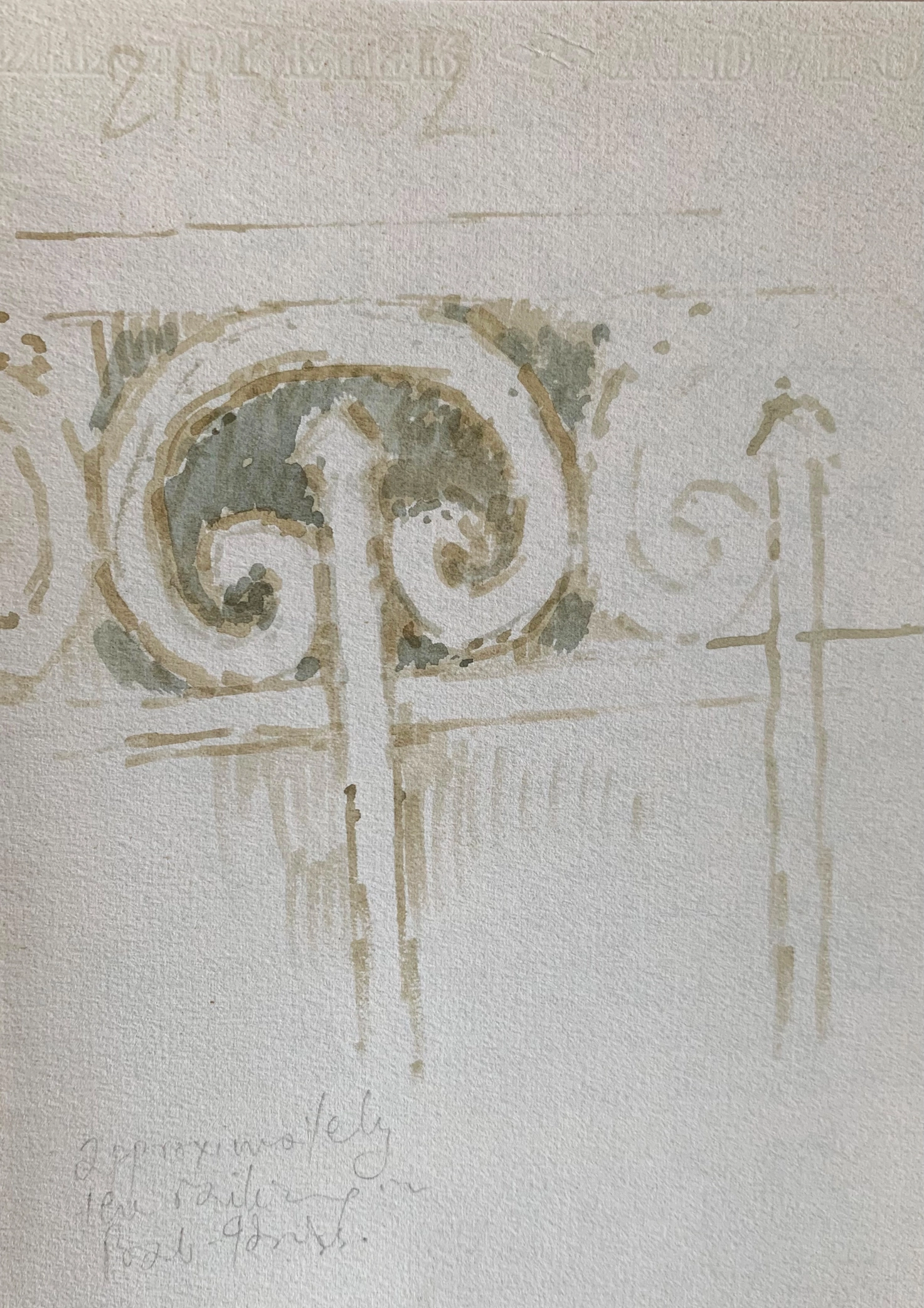 He explained that “the starting point of Fleisseh was the pencil drawing of the garden at Fleisseh. Can all drawings begin as drawings of Fleisseh? As a paint-feeling? Objectified? Realized in figures? Or left as abstract musicality?”49 In this sketch (fig. 7), one can clearly see how the floor plan of the garden in Fleisseh structures the composition, which is then taken to a metaphorical level.