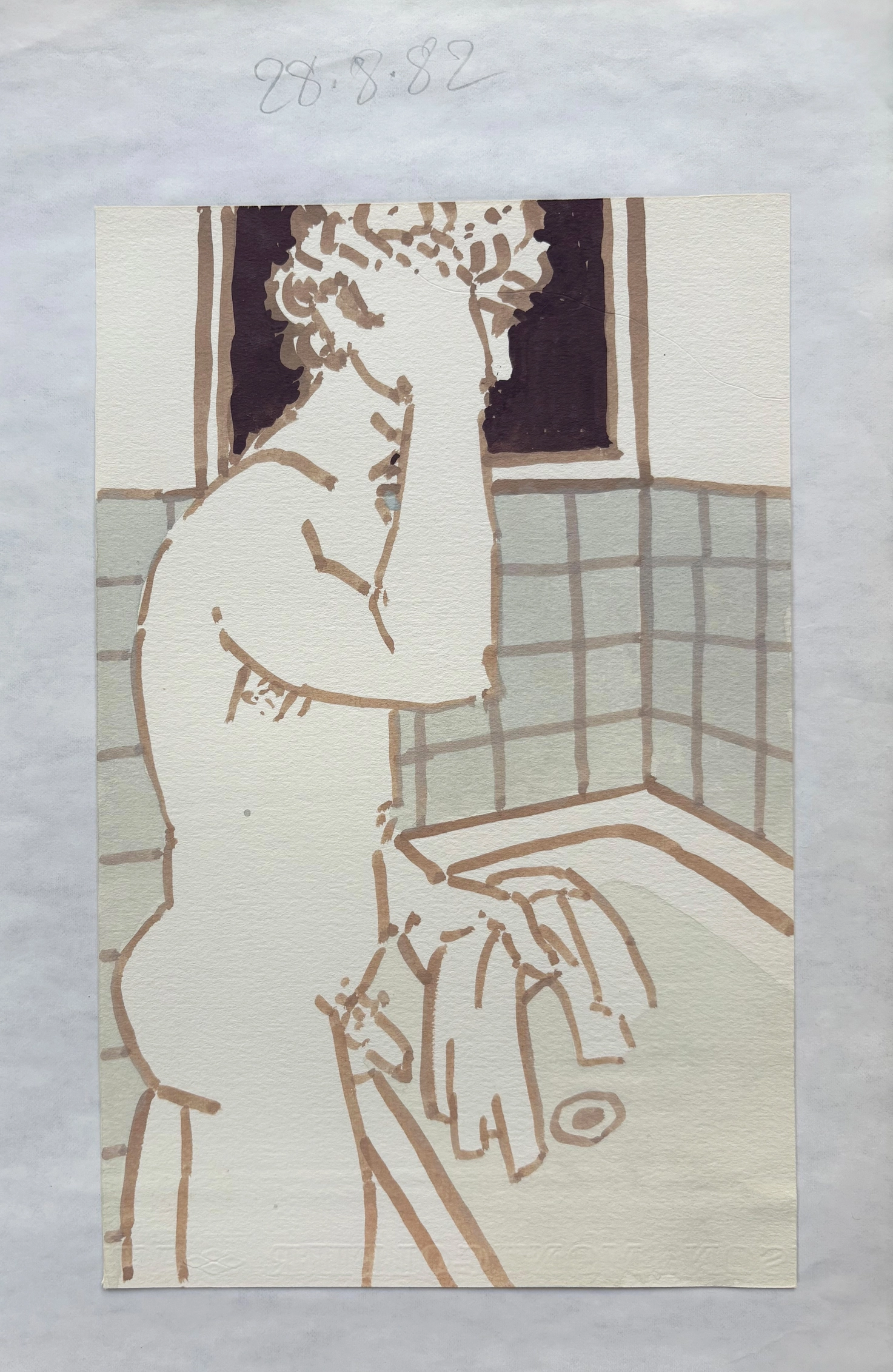 Fleisseh was thus also a refuge, a recurrent motif of Barrage.51 The perceived need for a safe hiding place was linked to being a gay man in the Eastern Mediterranean at the time, be it in Lebanon or Greece, in which he considered Fleisseh a small niche he had carved out for himself, a “precarious hideout.” He was deeply unhappy about not being able to find a “simpler happier relation between [his] work & life,” in which he did not have to take refuge in abstraction.52 Not feeling comfortable openly depicting male nudes in his painting, he looked for ways to mask or diversify his subjects. An example for diversification was to show men “through a cycle of their days,” such as when they bathed, dressed, or played billiards (fig. 8).53 While this diversification was expressed in figurative work, mostly small-scale, masking was done through abstraction. Masking one’s subject has been associated with queer tactics of camouflage, in which abstraction “both conjures new visualisations and rebuffs viewers’ impulses to recognize and categorize.”54