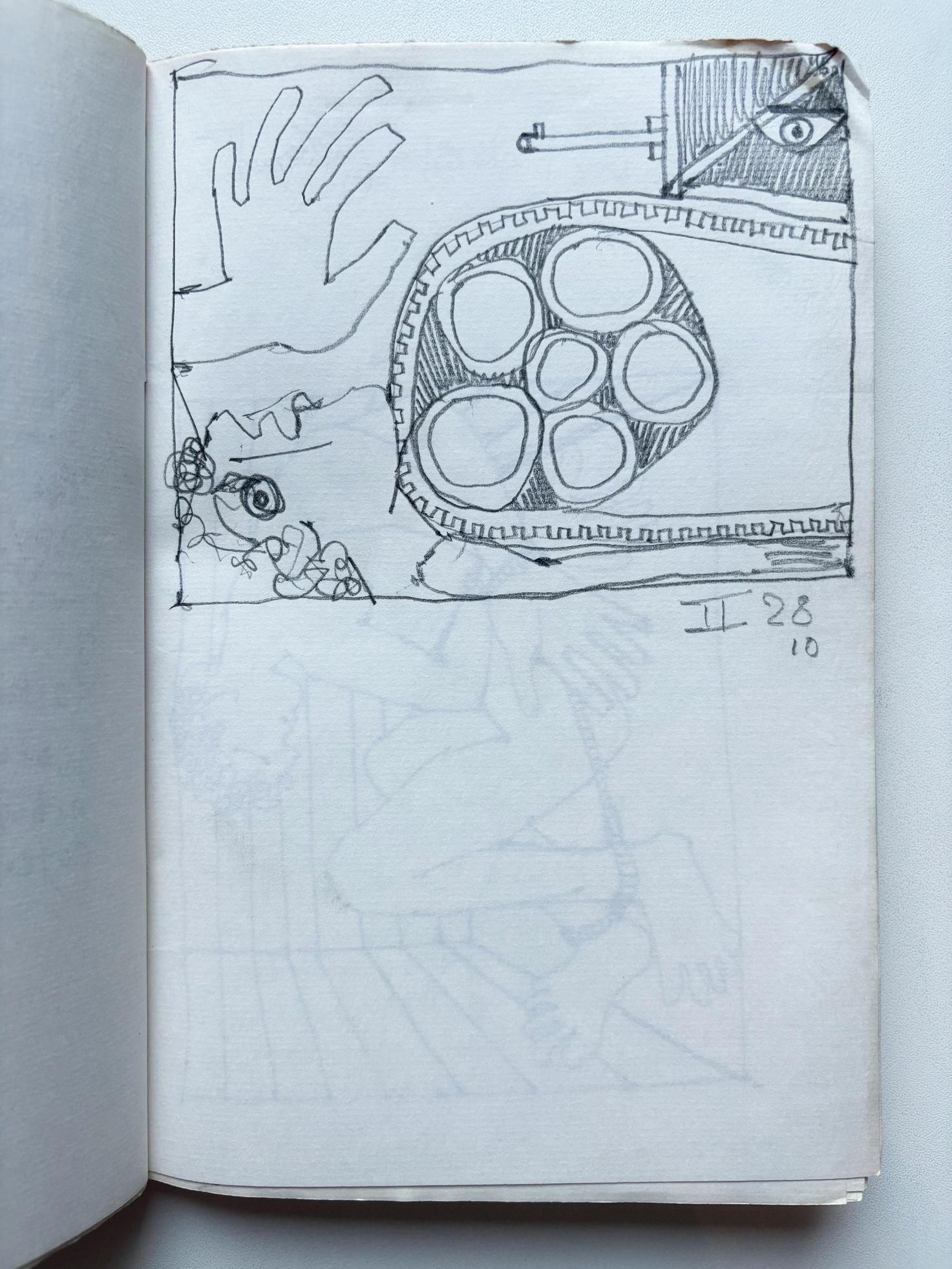 In his diary, Barrage described recurring symbols—in an entry he labelled as “frames for different portions of an idea” (fig. 2)—such as cupboards, mirrors, jars, niches or refuges. The entry includes ones specific to the experience of war, such as “barbed wire” and “wedge as war engine.” He writes about another sketch of the same day (fig. 3):
