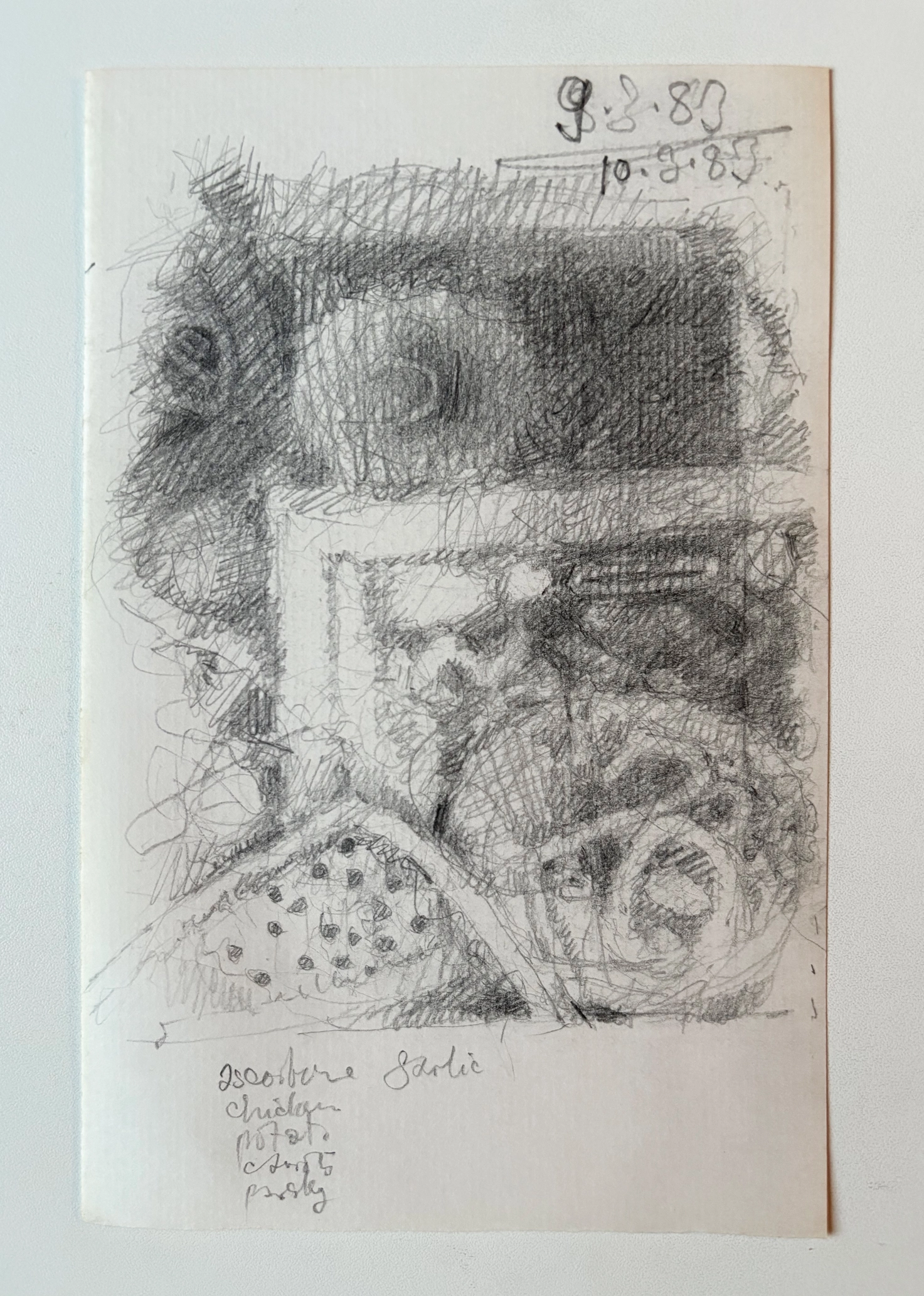 “His way of life” refers to living out his homosexuality in a traditional society, where there was no easy path to follow.13 Barrage seemed to have found his way to navigate this life, however. After leaving Lebanon, he frequently referred back to his happy days in Bab Idriss, and an allusion to elements of his apartment are found in his drawings and paintings. In a sketch of August 1982, he studied the railing of his house in Bab Idriss (fig. 1), for instance, and later that year drew an abstraction referencing his kitchen there. The railing, drawn just after Beirut had been intensively bombed by the Israeli army in the summer of 1982 to force the eviction of the Palestine Liberation Organization (PLO), is a tool to protect, but it also separates. The particular shape of this railing evokes a penetration, which can be read in both an erotic and a war context. The same day of the sketch, he writes in his diary: “P.L.O. beginning pullout of Beirut this morning. I am tired, tired. I don’t think I will ever go back there.”14 Tainted by memories of war, he continued dreaming of Bab Idriss as a refuge, however, “where [he] would discover in the ruined passages and moulderly remains a set of sunny rooms hidden from war, secret and all [his] own.”15