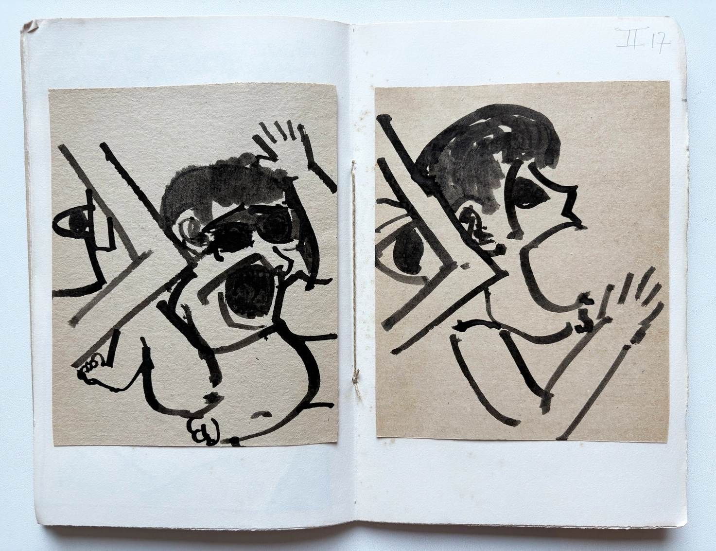 War motifs preoccupied him for a couple of years, not continually but periodically. The 1976 massacre of Tall al-Za‘tar, in which Palestinian civilians were killed by Christian militia after a months-long siege, was one of the themes he treated when already living in Athens.25 Barrage had left Beirut in July 1976, first moving to Alexandria (July–October 1976), then Istanbul (October 1976–January 1977), before settling in Athens in January 1977. Early notes from Greece reveal his struggle to depict such scenes: